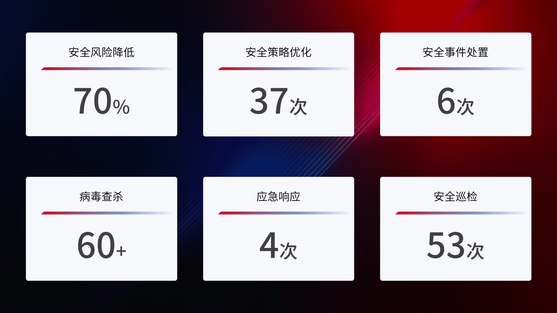 提供全面的安全事件报告体系,,,,包括处置报告、、周报、、季度和年度总结,,结合持续监控,,,帮助客户深入了解网络安全状况。。